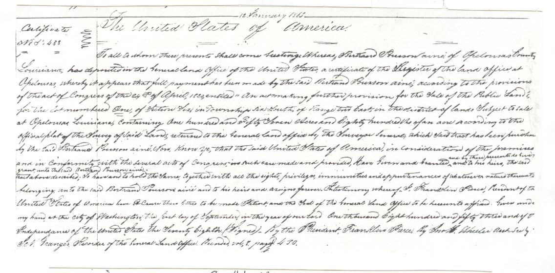 It seems his principal land holdings after coming to Lacassine were: 40 acres, the NW 1/4 of SW 1/4 of Sect 30 T 9 SR 5 W, the tract on which the church and cemetery is now located at Lacassine: 40 acres just south of such tract, across the road, being the NW 1/4 of NE 1/4 of Sect 31 T 9 SR 5 W: and 40 acres of woodland, being the SW 1/4 of NW 1/4 of Sect 8 T 10 SR 5 W, which is about 3 miles southeast of Lacassine. (Note: Jeff Davis Court House conveyance Book Q page 34 - 8 Sept. 1919 - United States to J. Bertrand Pousson Homestead (ref. exhibit 54) Cert #790 application #2428 W 1/2 of NE 1/4 and W 1/2 of SE 1/4 Sect 30 T 9 SR 5 W - 163 acres given in Washington 15 Apr. 1879.) (Also Note: Jeff Davis Court House conveyance Book T page 446 and 447 - 16 July 1920 - Victor Verrett to J. B. Pousson - Victor Verrett "he is well acquainted with J. B. Pousson, who by deed dated 30 Aug. 1871 filed for record 14 May 1903 and recorded in Conveyance Book # 53 page 119 of the records of Calcasieu Parish, La. purchased from the succession of Bazilide Bonin, widow of Joseph Deroin the following: SW 1/4 of NE 1/4 of Sect 20 in T 10 SR 5 W". This same land was sold to Victor Verrett by deed 22 Dec. 1874 filed and recorded 26 Sept. 1876 in Conveyance Book F page 107.)